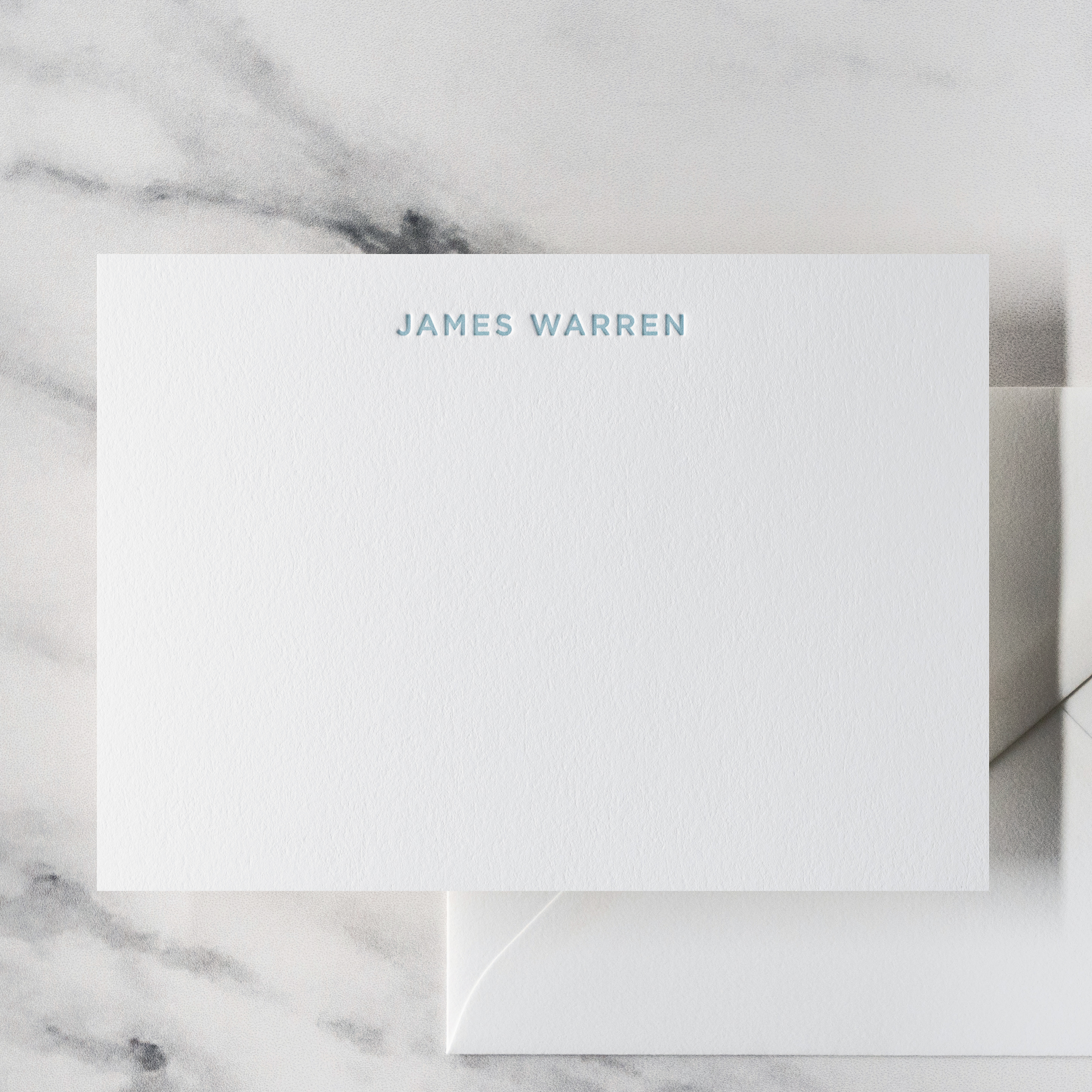 This custom letterpress printed note card set features a clean sans serif font for a cool, modern look. The design feels both classic and contemporary—perfect for professionals or anyone who appreciates refined simplicity. Shown here in dusk blue ink, it looks sharp in any color, bright or dark.